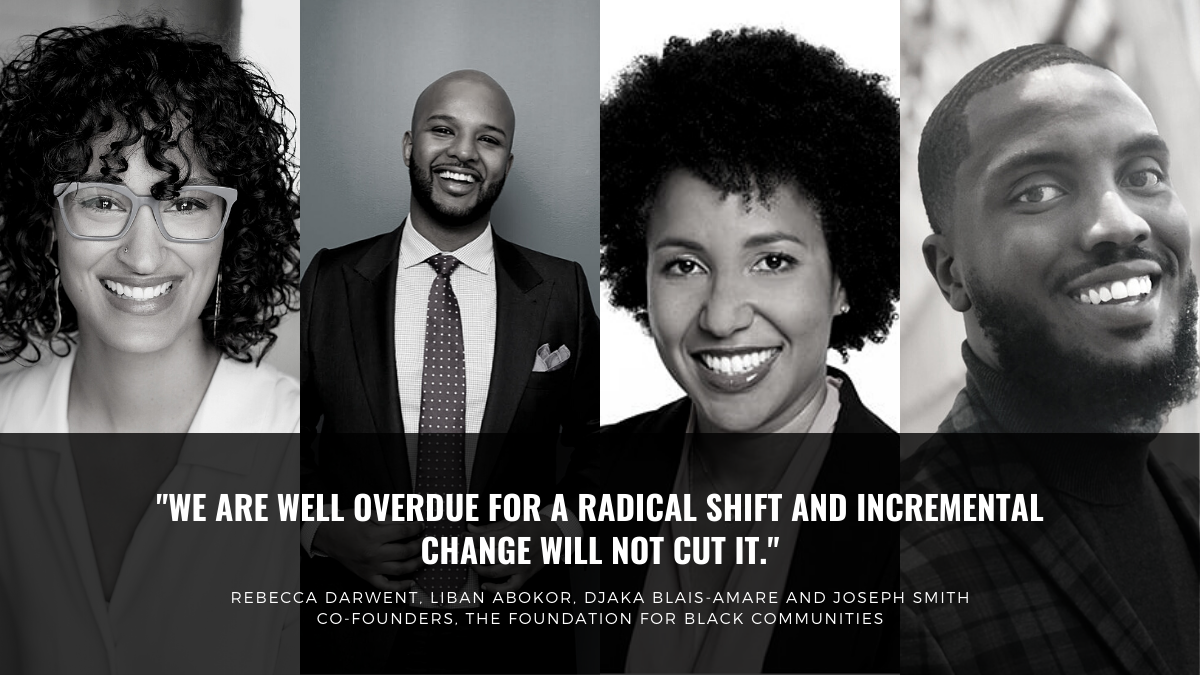Rebecca Darwent, Liban Abokor, Djaka Blais-Amare and Joseph Smith got together to create the Foundation for Black Communities late last year, after years respectively working in the social impact world and witnessing the effects of vastly underfunded Black-led and Black-serving organizations.