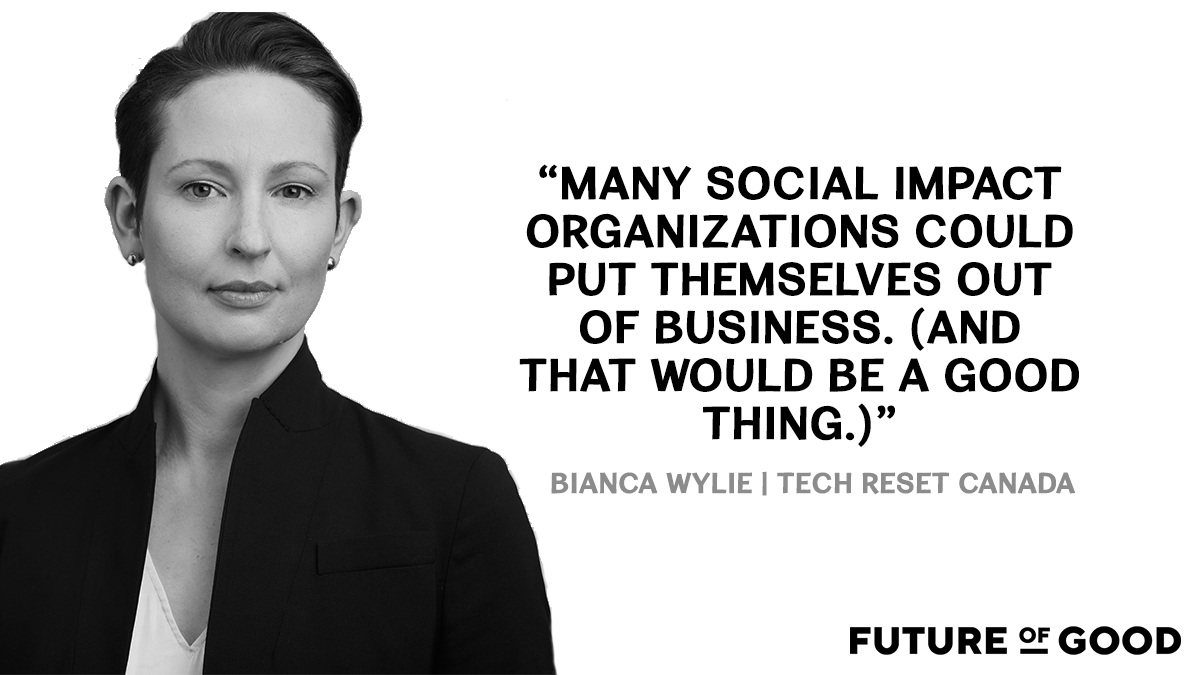 Bianca Wylie believes the best-case scenario for the social impact world in 2030 is one where it steps back and stops “patching around democracy.” While she doesn’t doubt the important work social impact sector professionals perform, she believes governments should step in over the next decade and take increased responsibility for the sector’s most vital roles, including community support services, tackling hunger, and addressing human rights. Why? Put simply, it is more democratic. “With the government, there is power that we as people have if we want to hold governments accountable,” she says. Ultimately, she believes social impact organizations should really be thinking about how to put themselves out of business by 2030. The sector needs to ask itself some tough questions about its involvement in the status quo, Wylie says, and how it can mitigate its own necessity. “I don’t think this sector should be seeking to grow,” she says. “It should be seeking to shrink.”