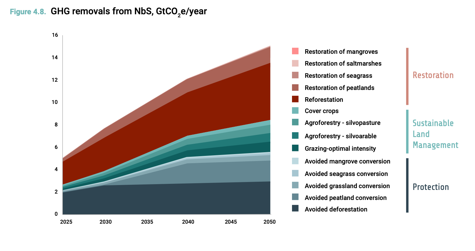 Below: In the Rio-aligned scenario, net deforestation would end, and reforestation would scale significantly by 2030, resulting in 7.7 GtCO2e per year in GHG removals. More costly NbS, such as peatland restoration and agroforestry, would scale significantly to 2050, contributing to a total of 5GtCO2e per year in removals.