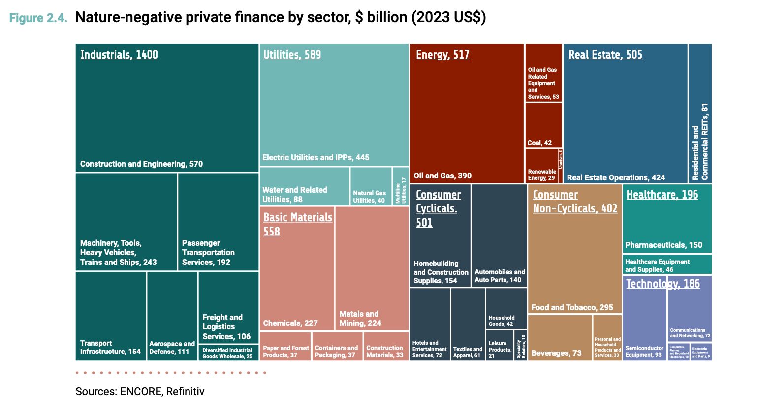 Below: Private nature-negative finance flows are 140 times larger than tracked private investments into Nature-based Solutions.