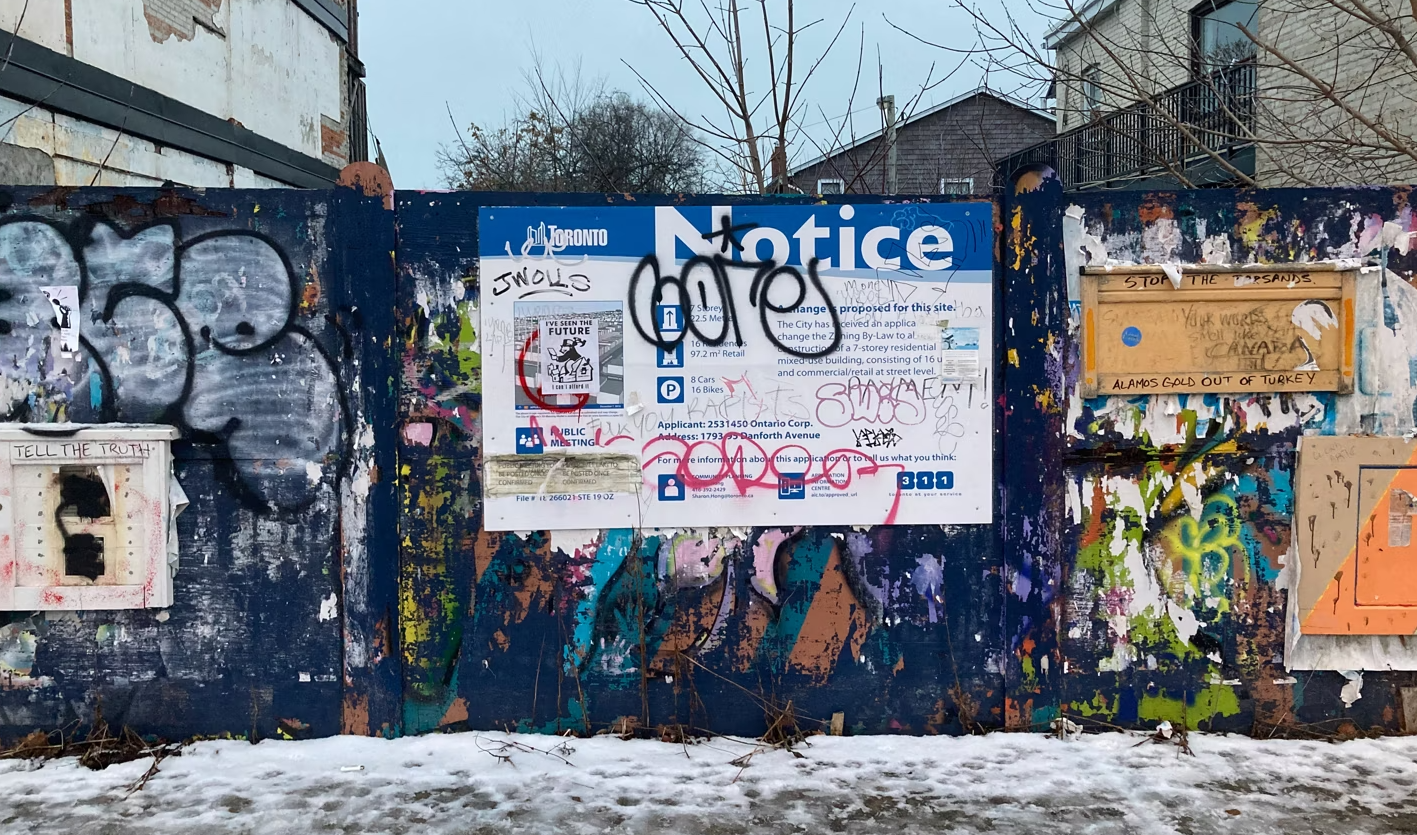 These posters on doors, buildings, and panels inform people that a project is planned for their neighbourhood and invite public input.