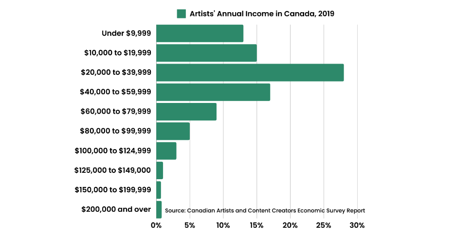 Salaries in the arts and culture industry can be both low and precarious. The Government of Canada’s Job Bank shows that the median wage for a musician is less than $31,000. According to data from the Employment Insurance Survey, the highest end of an hourly wage for an artist was around $42.