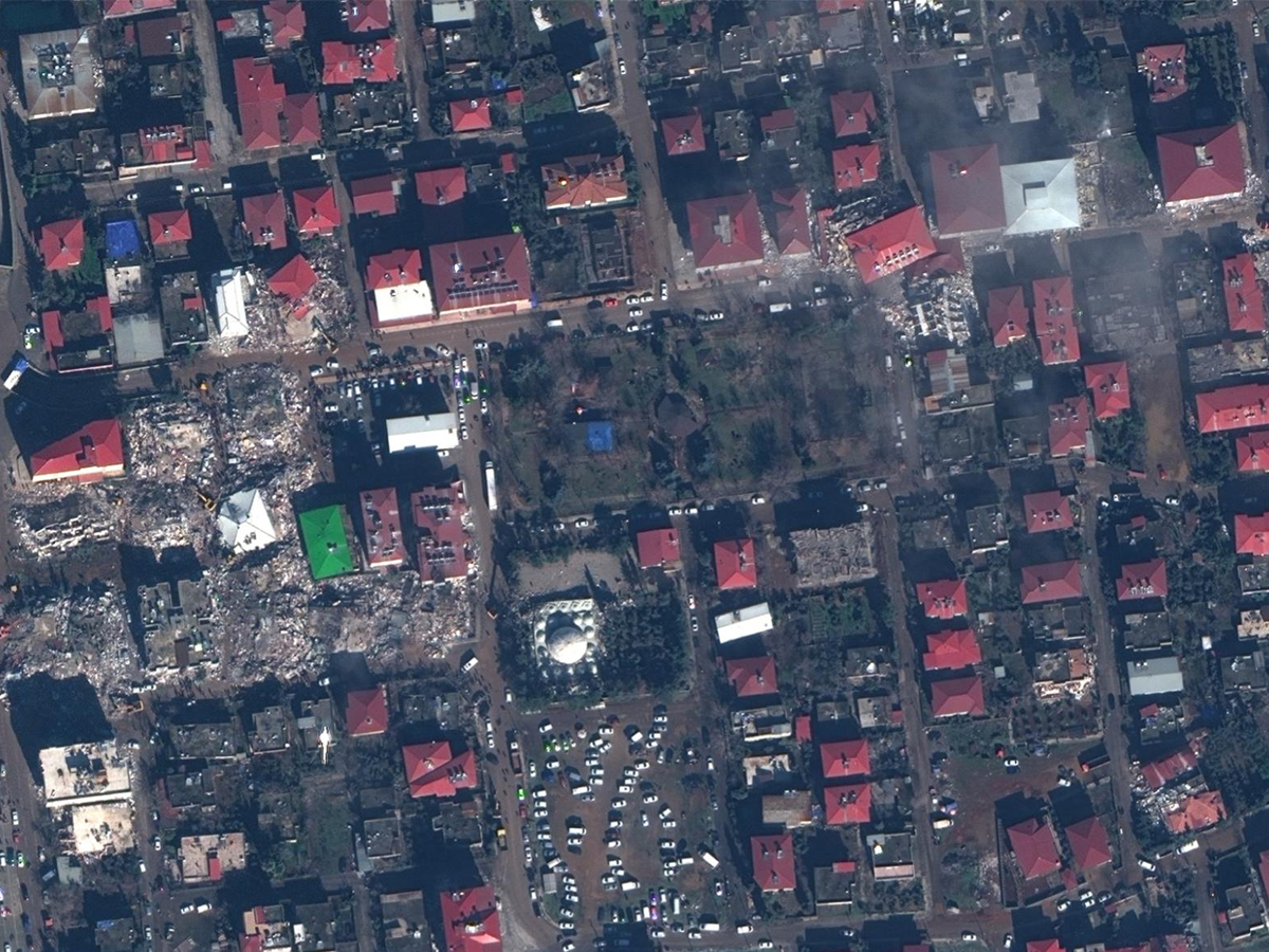 Image Caption: Satellite images captured by Maxar Technologies, showing collapsed buildings and rescue operations taking place the day after the earthquake, in the Turkish city of Ishahiya. [Satellite image ©2023 Maxar Technologies]