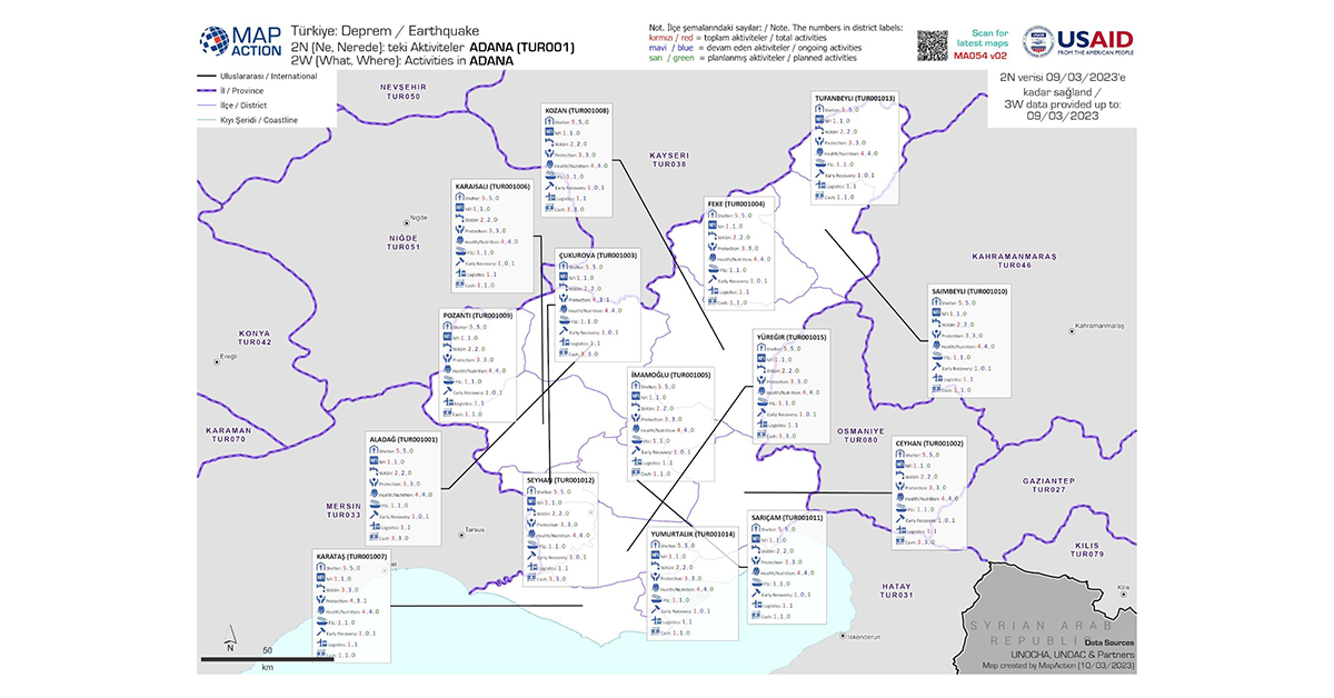 Image Caption: Produced by MapAction, this digital map shows a breakdown of aid activities that are ongoing and planned in each region of Türkiye affected by the earthquake, such as shelter facilities and health and nutrition services. [Image courtesy of MapAction].