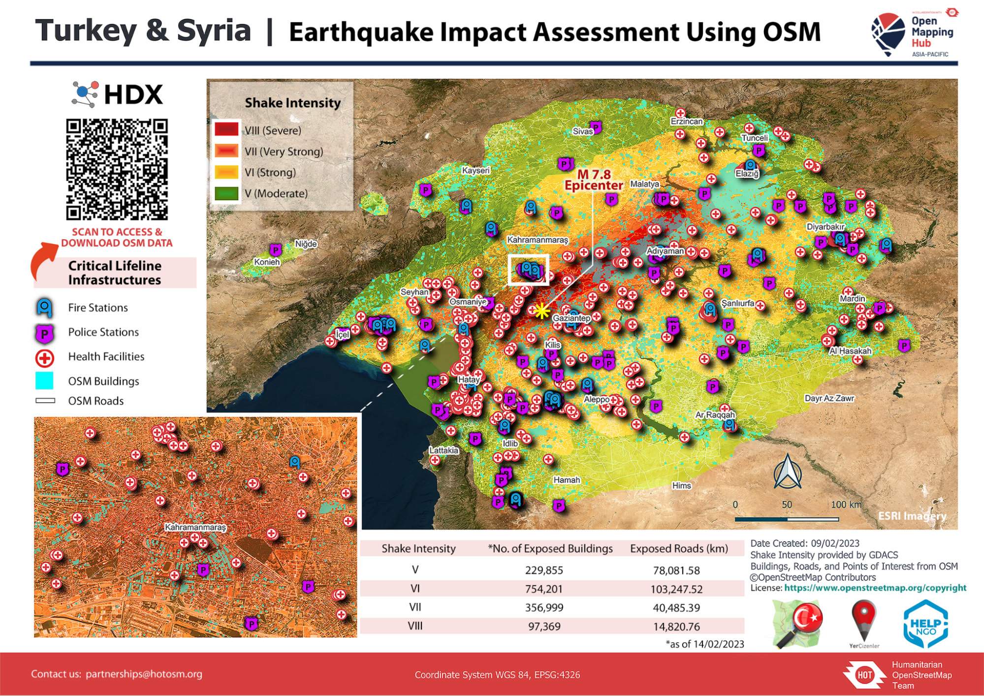 Image Caption: The above map, created by the Humanitarian OpenStreetMap team, shows the intensity of the earthquake in different parts of Türkiye and Syria, as well as making health facilities, fire stations and police stations. [Image courtesy of HOT]