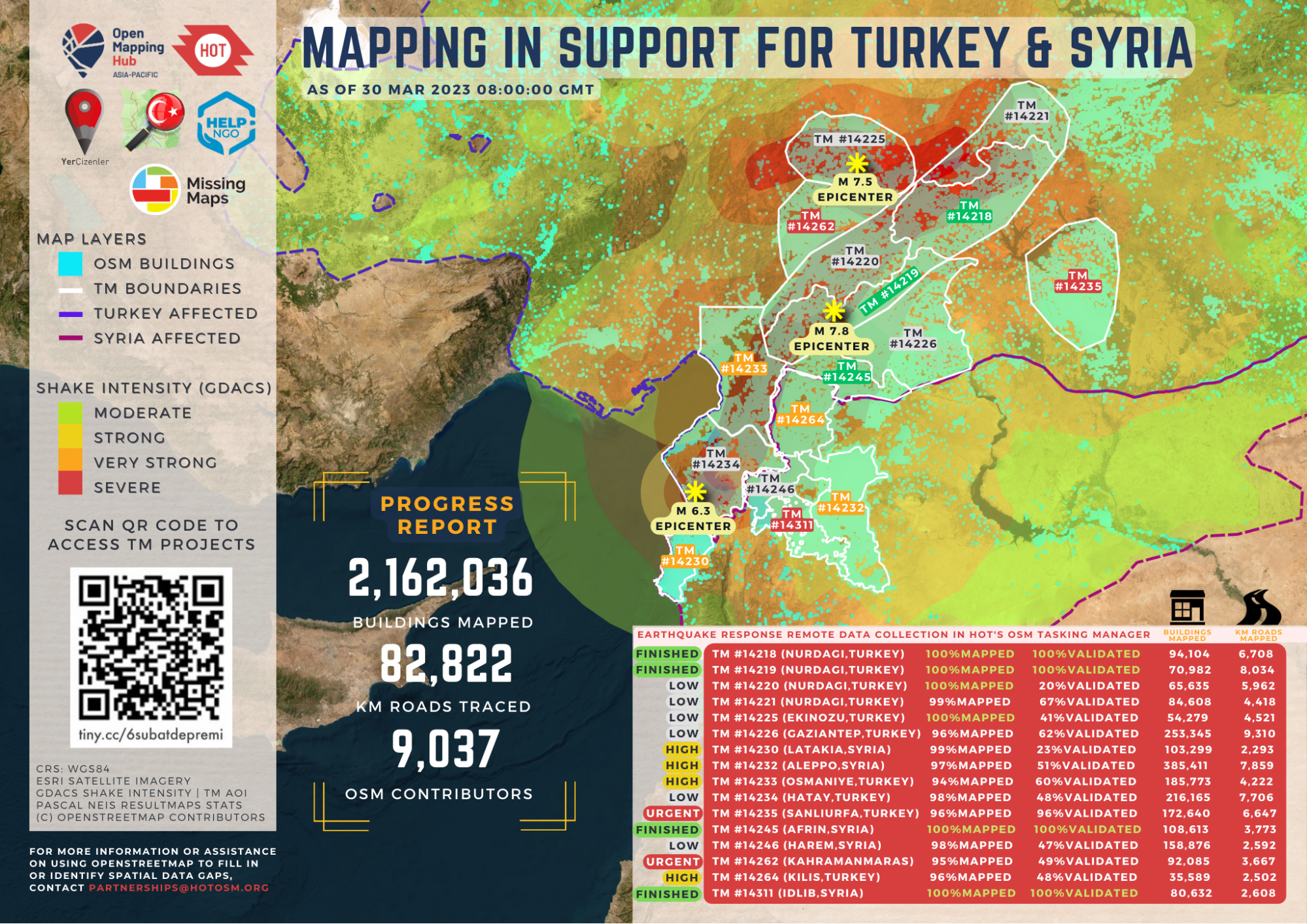 OSM is fast becoming a critical tool in informing emergency response, both in Türkiye and Syria, and beyond. One month after the quake happened, the Humanitarian OpenStreetMap Team (HOT) reported that it had mapped not only roads, but critical infrastructure, like hospitals, food depots and new settlements, as well as any damage to buildings. Aid agencies, such as Türkiye’s Ministry of Interior Disaster and Emergency Management Presidency, and the Search and Rescue Association, reported using the maps to logistically coordinate where to send emergency resources.