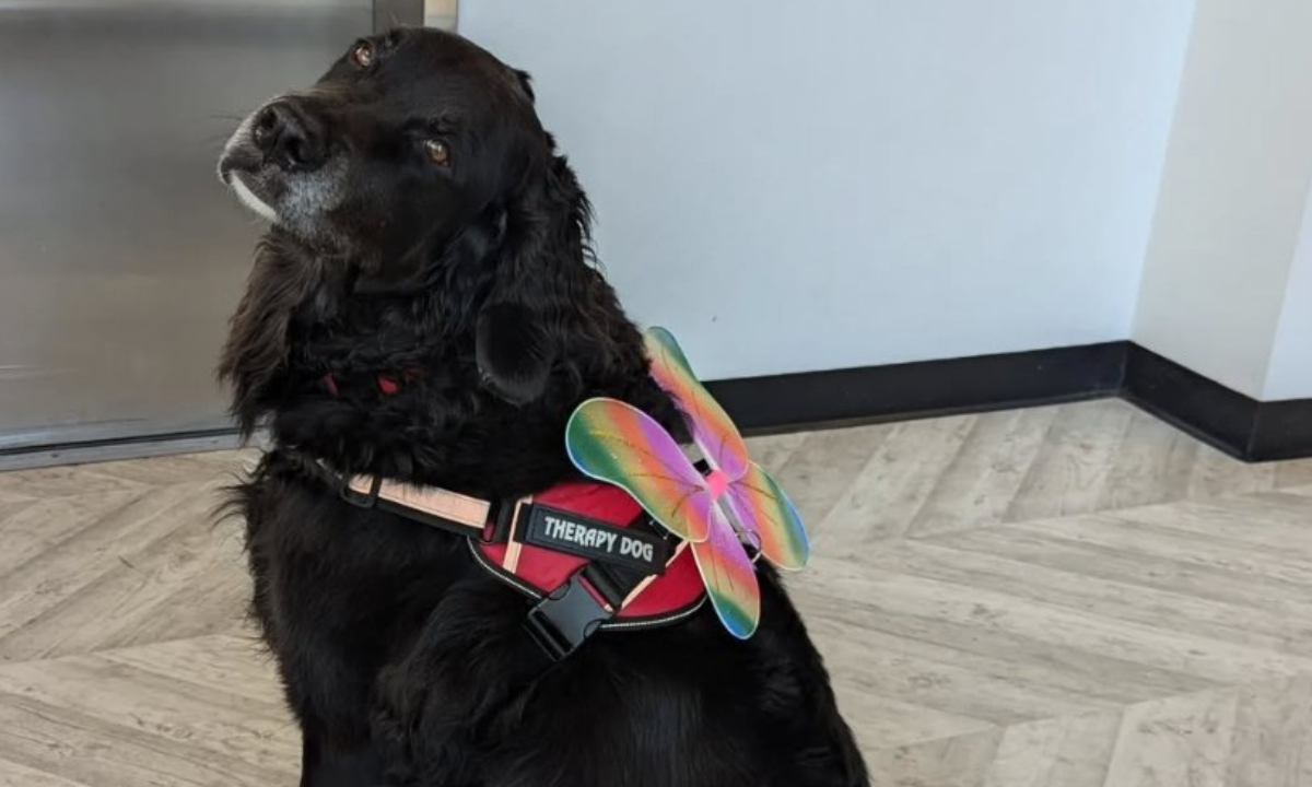 Murphy may be jet-black, but he is a Golden Mountain mix and is seven years old. He started with Carleton University’s Therapy Dog program when he was only a year old – proving he was a great candidate from the start. He’s unique in that he’s available to students during office hours – meaning if you have anxiety about a meeting with your instructor, he can be there to provide comfort.