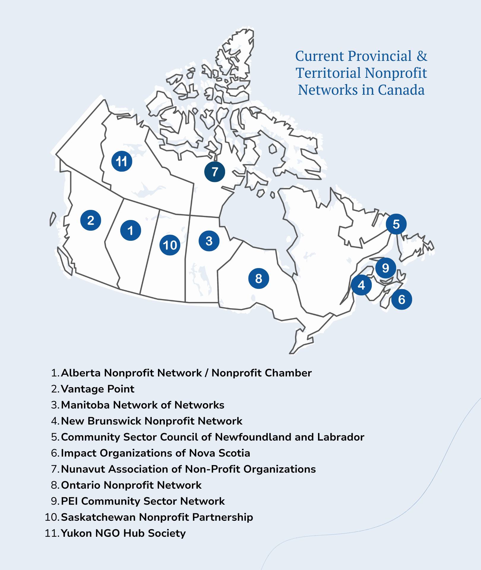 Among the non-profit networks that have received funding are established groups like Impact Organizations of Nova Scotia and Vantage Point in B.C.. Others, like the Yukon NGO Hub Society, the Manitoba Network of Networks, and the Saskatchewan Nonprofit Partnership are emerging networks.