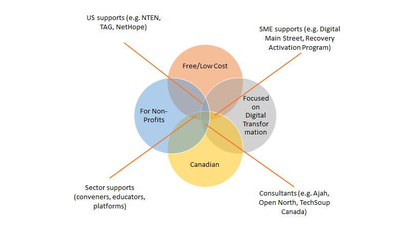 We can agree that digital transformation is not cheap, and resources in the sector are always stretched. The sector needs supports that are free or low-cost for the user, focused on digital transformation, and available to non-profits in Canada. A vanishingly small number of such supports exist, but adjacent ones are available – such as free digital transformation assistance for Small-Medium Enterprises or digital transformation tools focused on US non-profits. The systems-level play is to retool, scale up, and streamline existing supports so they hit, and expand, the bullseye of the Venn diagram.