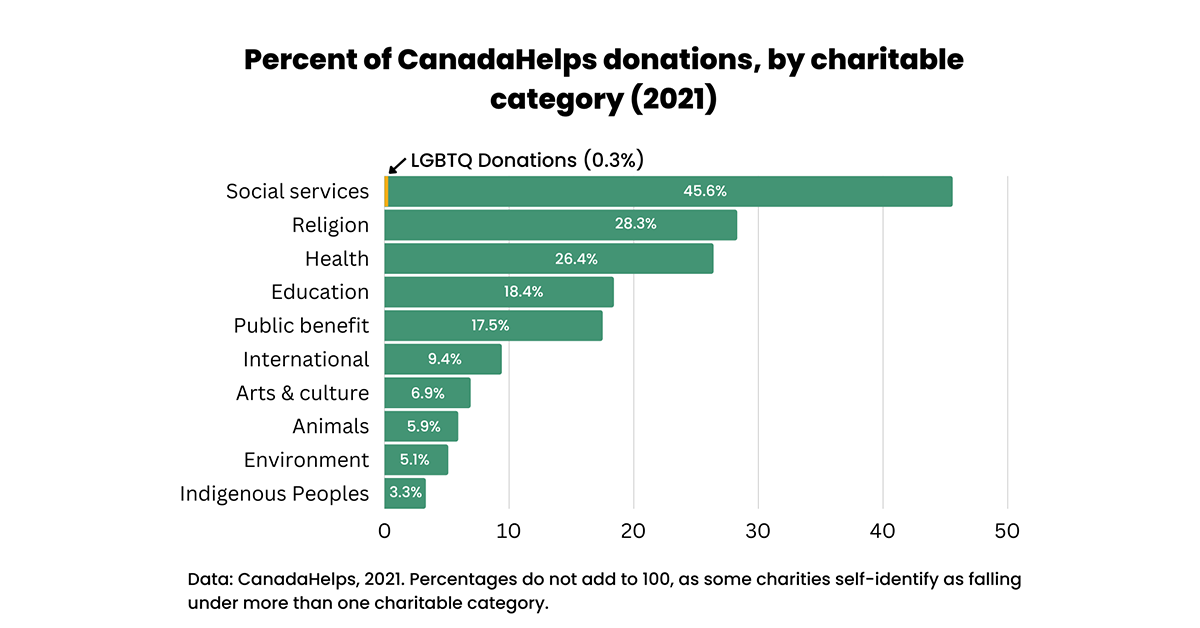 While there is no comprehensive study analyzing the share of donations that flow to 2SLGBTQI+ organizations in Canada, donation data from CanadaHelps, a leading donation platform, shows queer and trans causes get a tiny fraction of the overall donations made on their platform.
