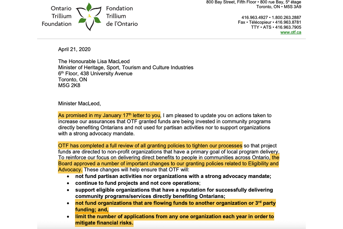 On January 17, 2020 — three months before the shared platform policy was repealed — Bambrick sent a letter to Minister MacLeod thanking her for meeting with foundation staff in the days prior. She added the Trillium Foundation had set a “full review” of its policies in motion to ensure granted funds were invested in community programs directly benefiting Ontarians and not supporting organizations with a “strong advocacy mandate.”