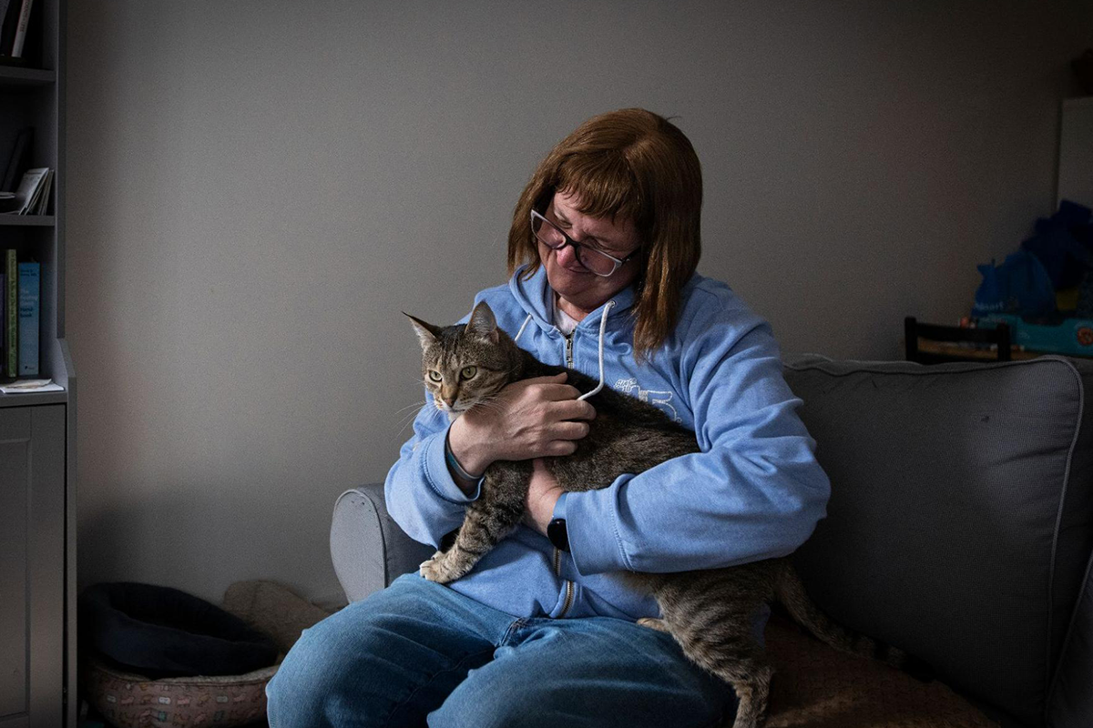 Co-op resident Jodi Gray holds her cat Chuck, one of two cats she adopted after moving into her apartment at the Atira Workers Housing Co-Op. Photo: Jennifer Gauthier