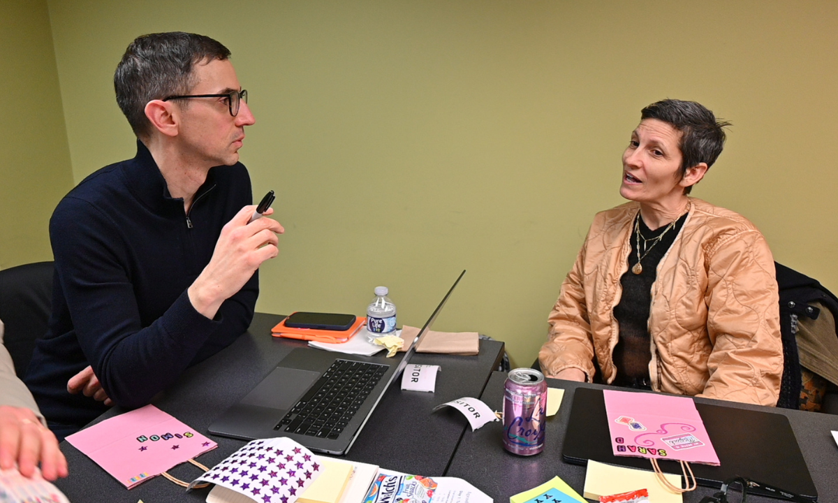 Sarah Di Troia, managing director of the OutcomesAI stream at Project Evident, right, speaks during a team retreat earlier this year. Project Evident has been carrying out research on AI adoption in the U.S. non-profit sector, and is now looking at the organizations that have the power to drive technology: the funders themselves (Project Evident / Facebook)