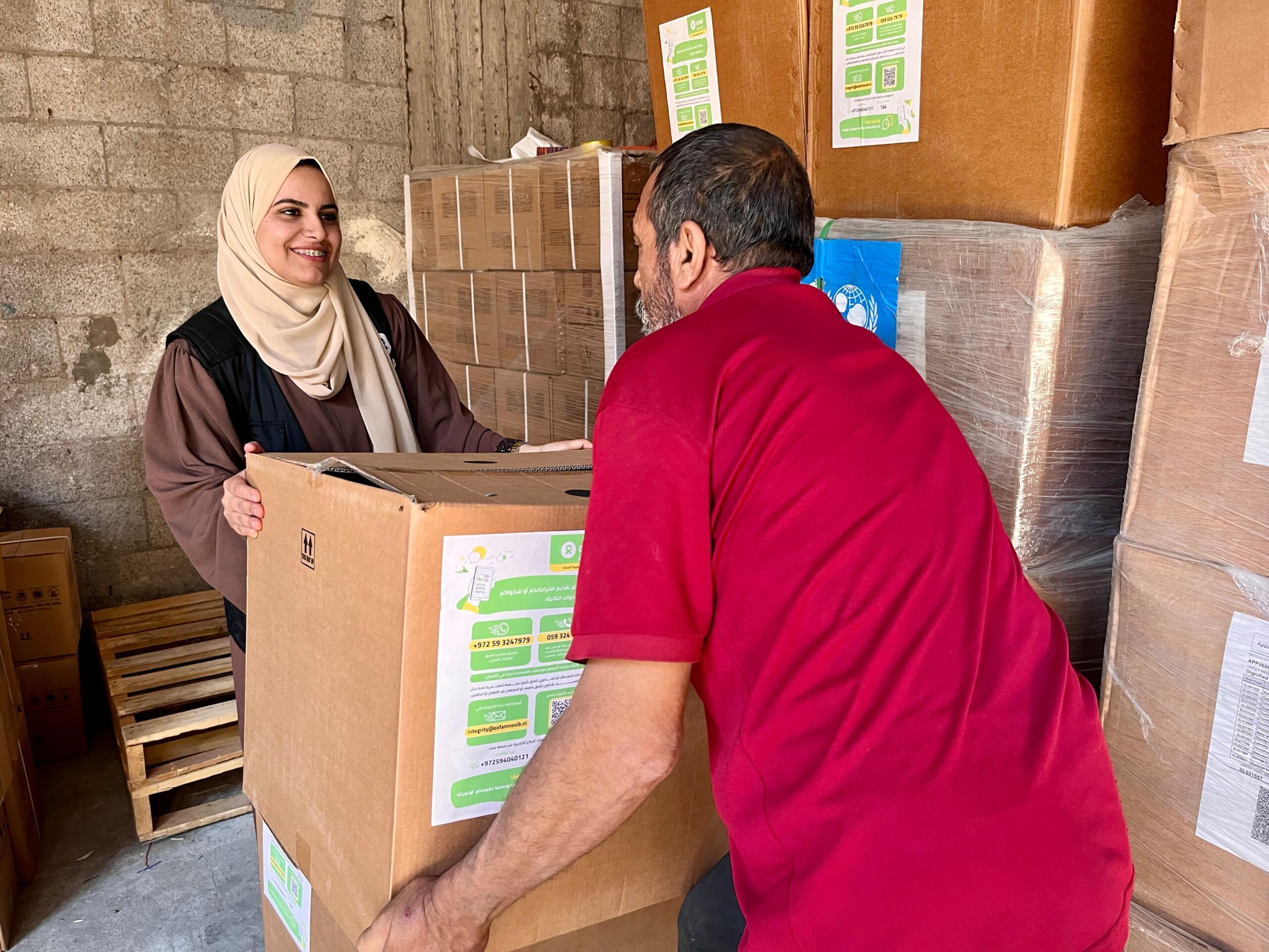 Oxfam staff in Gaza distribute hygiene kits. (Jomana Khalili/Oxfam)