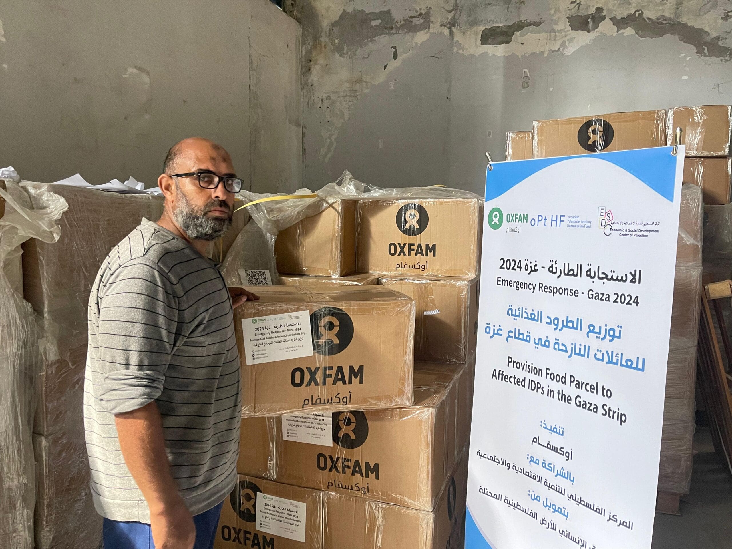 A community member receives a food parcel from Oxfam in Gaza. (Jomana Elkhalili/Oxfam)