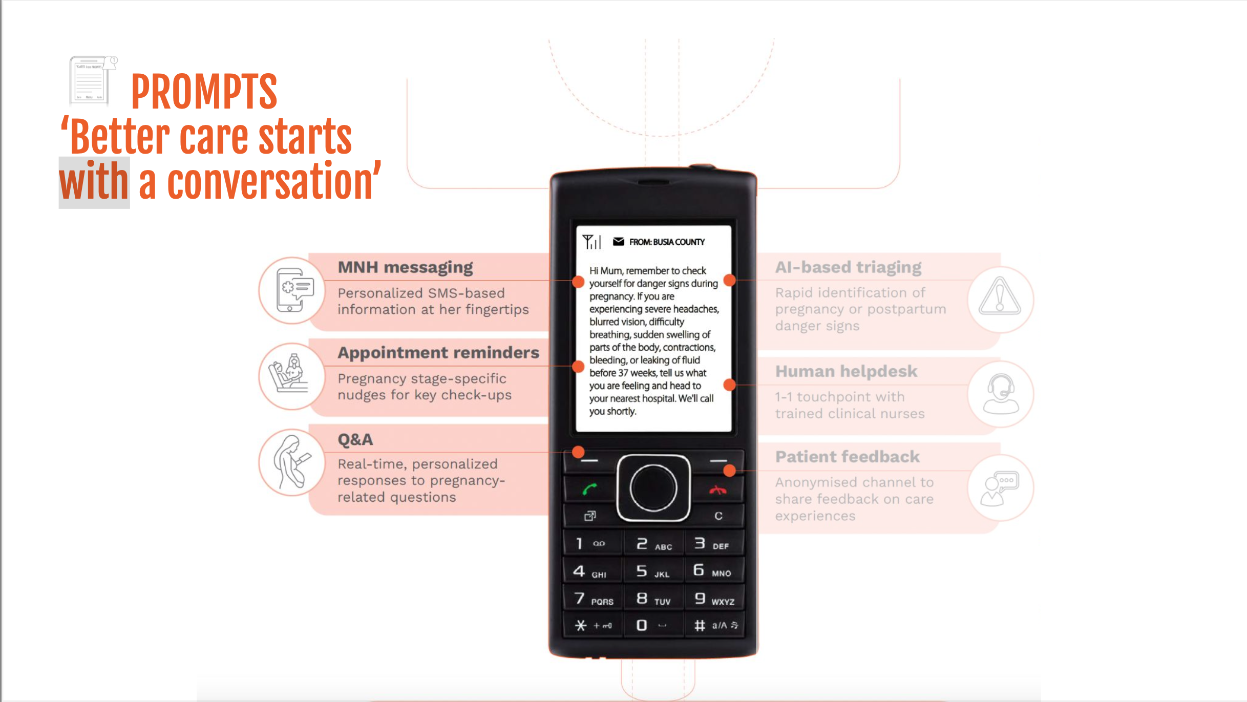 PROMPTS—short for Promoting Mothers in Pregnancy and Postpartum Through SMS—is an AI-based text messaging service that provides information to and responds to questions from pregnant and postnatal mothers and facilitates referrals to hospitals.