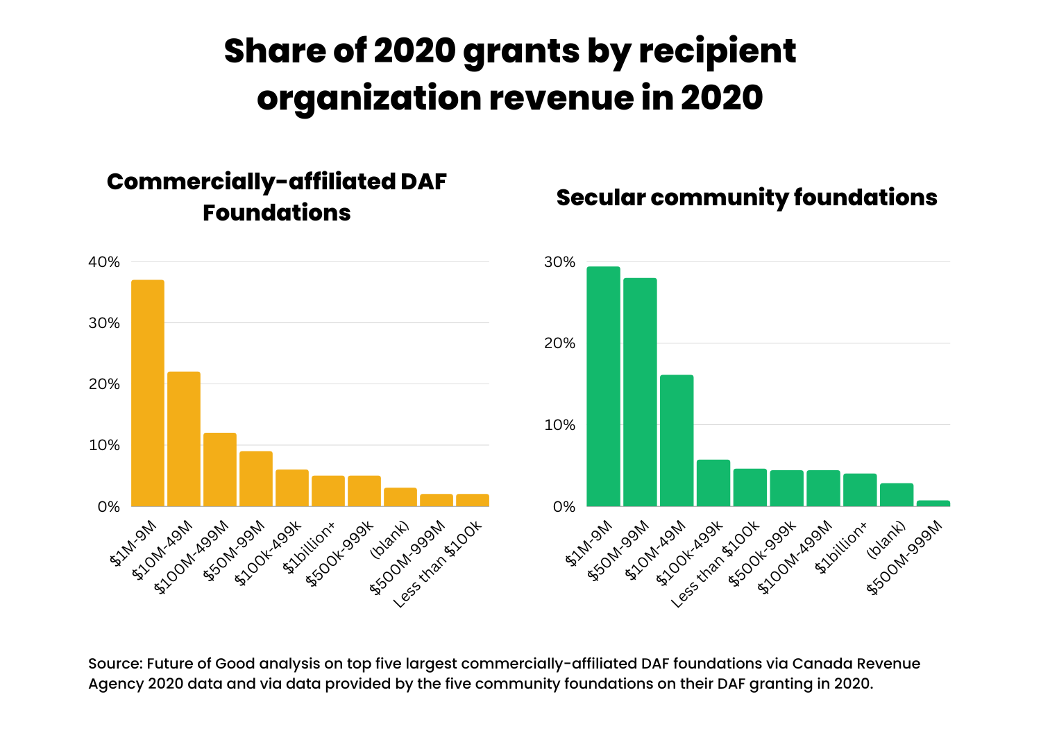 Methodology: For this story, we compared the 2020 grants from the five largest secular community foundations and the five largest commercially-affiliated DAF foundations as of 2021, excluding CHIMP: Charitable Impact Foundation. To do this analysis we asked the five largest secular community foundations to provide us with a list of their DAF grants from 2020, and we asked CRA to provide us with the same list for the five commercially-affiliated DAF foundations. From CRA, we also retrieved the list of all registered Canadian charities in 2020, including the charity’s address, number of full-time staff, revenue, social impact category and sub-category. We then merged the foundation grant datasets with the charity dataset, and analyzed by: recipient charity organization type, geography, size, and social impact area. Charity organization type was classified by CRA’s designations: public foundations, private foundations and charities. Social impact area was classified by charity “type” as per charitable registration with CRA. Several category types were combined to create broad categories (e.g. the education category includes several CRA categories, including: Teaching institutions, support of schools and education, foundations advancing education and education organizations not elsewhere categorized). Percentages do not add to 100 as 2-3 per cent of grants could not be included in the dataset as the recipient organizations did not have charitable numbers (e.g. grants to American Universities, First Nations without charitable status, or to the United Nations). All percentages are rounded to the nearest whole number. Data does not capture instances where money flowed through a charity to a non-qualified donee.