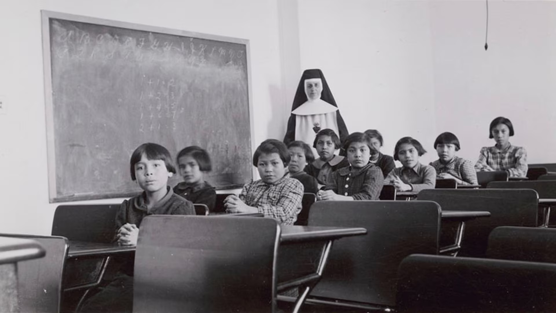 A group of female students and a nun pose in a classroom at Cross Lake Indian Residential School in Cross Lake, Manitoba in February 1940. (Dept. Indian and Northern Affairs/Library and Archives Canada)