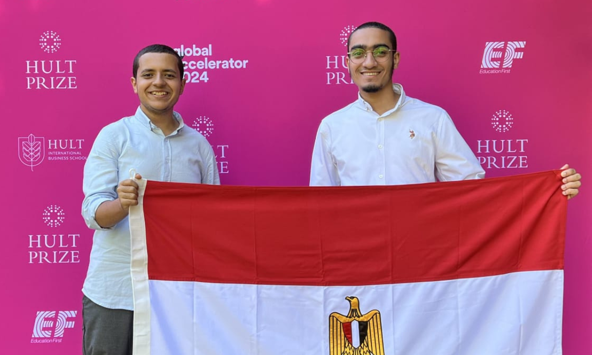 Creator and founder of Lothgha Hamza Abu-Alkhair (left) and partner engineer Ahmed Hamed Al-Shireef (right) at the Hult Prize qualifiers in Dubai, UAE, 2024.