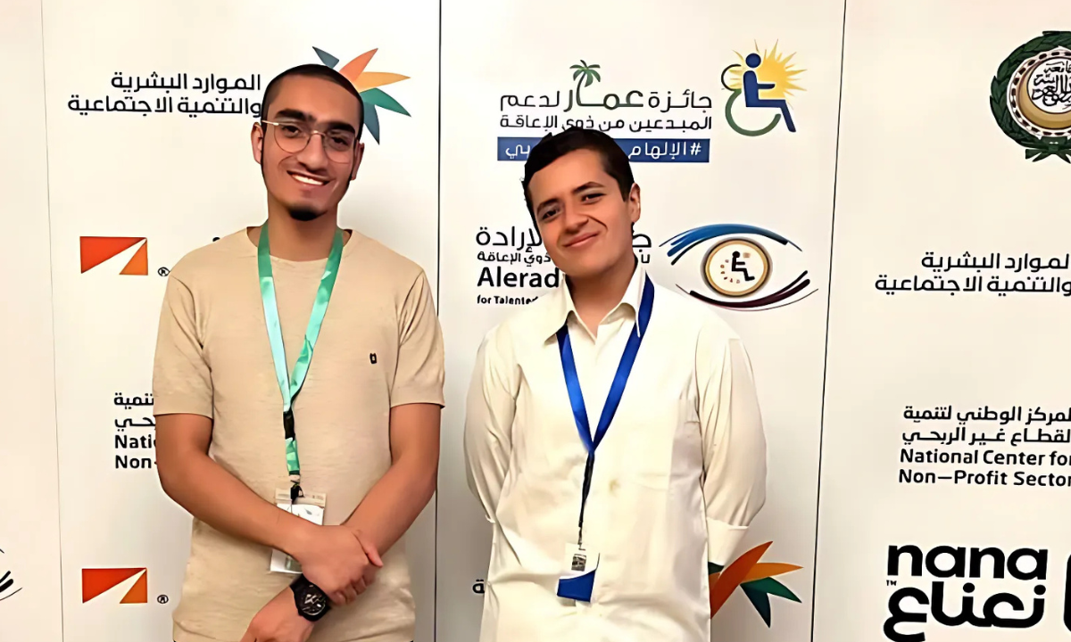 Hamza Abu-Alkhair (left) and partner engineer Ahmed Hamed Al-Shireef (right) at the Saudi Arabia-based Ammar Awards in 2024. Ammar Awards is a humanitarian initiative aimed at discovering talented individuals with disabilities and initiatives by non-profit organizations focused on innovations targeting people with disabilities.