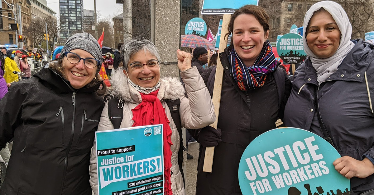 Members of the Atkinson Foundation staff team at a justice for workers demonstration in Toronto, ON. The Atkinson Foundation supports several organizations who organize for decent work. (Courtesy: Atkinson Foundation)