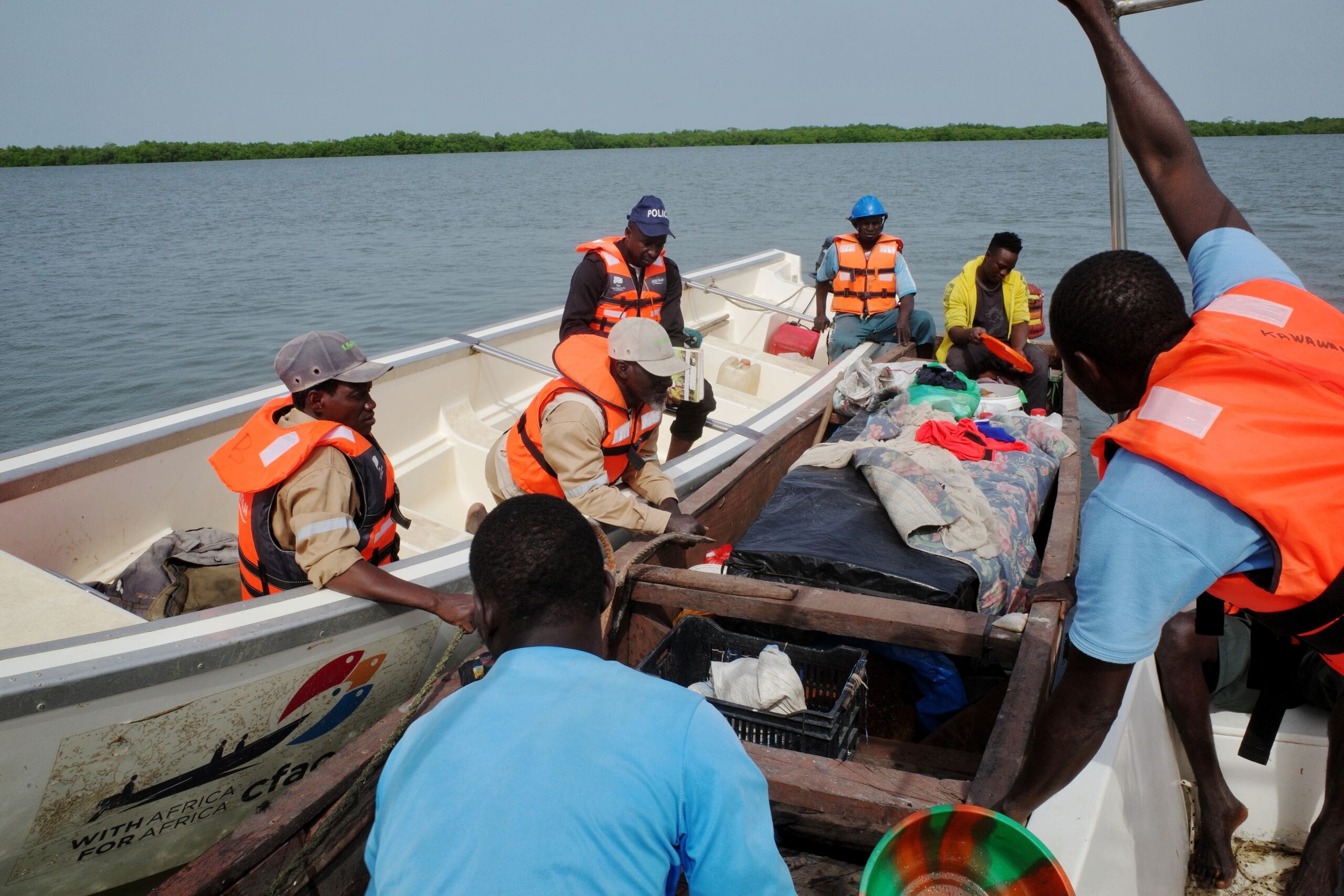 Kawawana patrollers and police intercept an illegal fishing boat on the Casamance River, a common scene in their efforts to protect the region’s resources. (Jahanzeb Hussain/Future of Good)