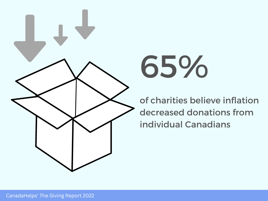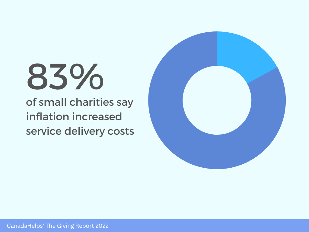 A recent CanadaHelps survey found inflation has increased service delivery costs for 83 per cent of small charities, while a further 59 per cent say demand for their services now exceeds their capacity to deliver.