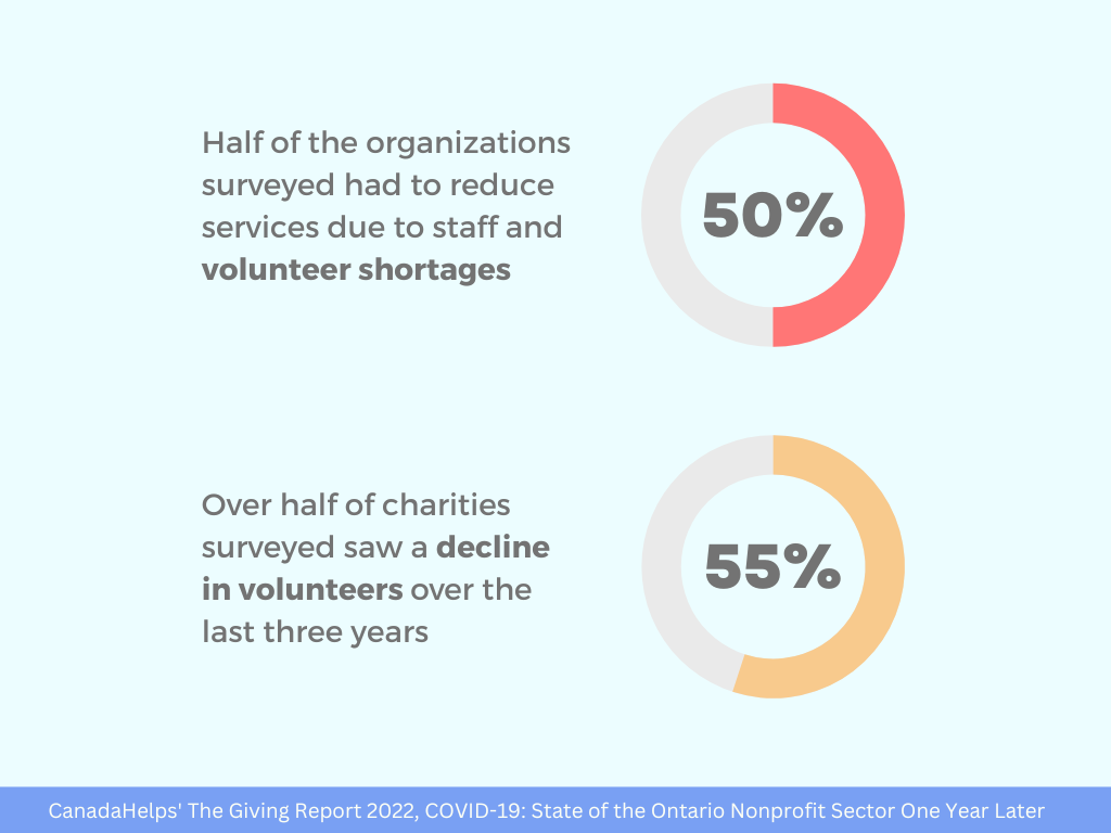 A survey conducted by the Ontario Nonprofit Network this summer found 65 per cent of respondents had challenges with recruitment and retention in the last year. Half of the organizations surveyed have also had to reduce services due to staff and volunteer shortages — even as 74 per cent of those asked said demand for their services had increased over the same period.