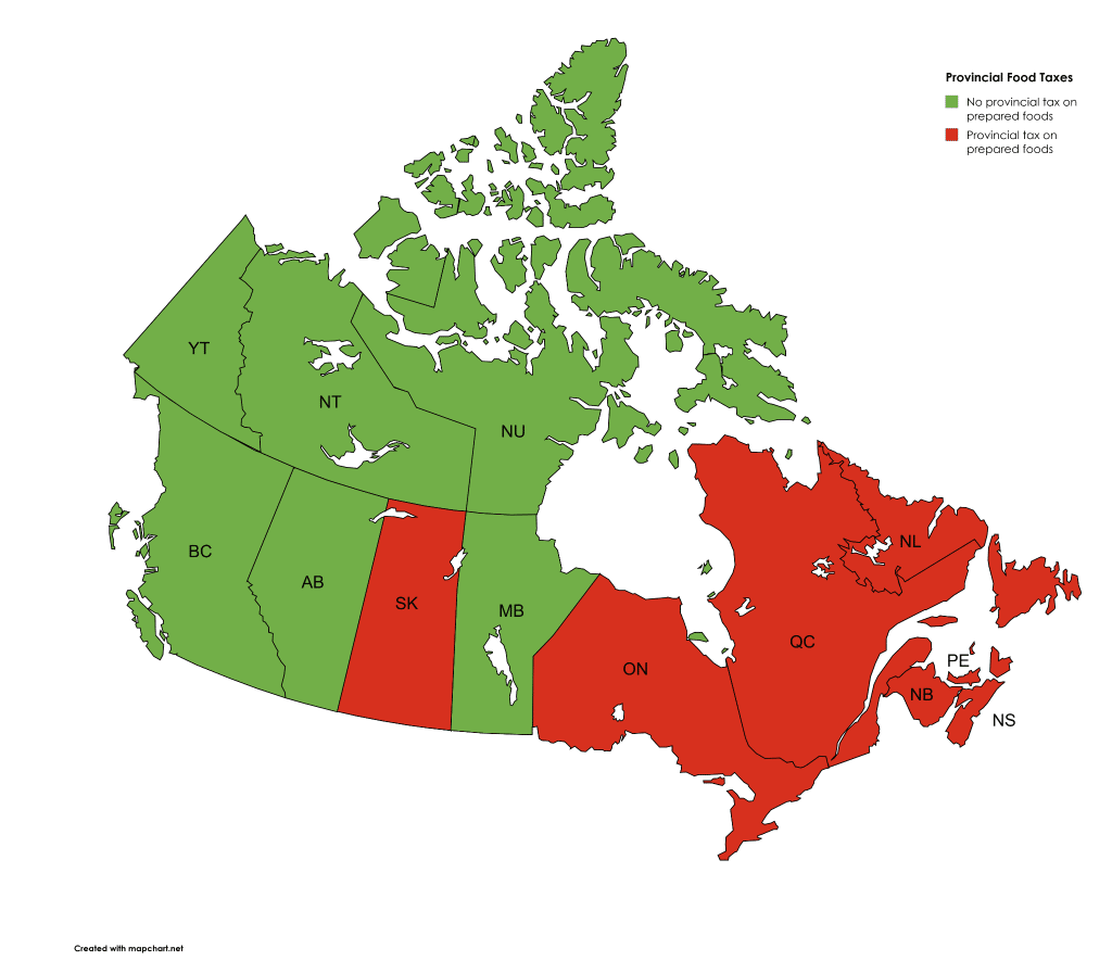 Several provinces and territories charge provincial taxes on prepared foods, but not all of them.