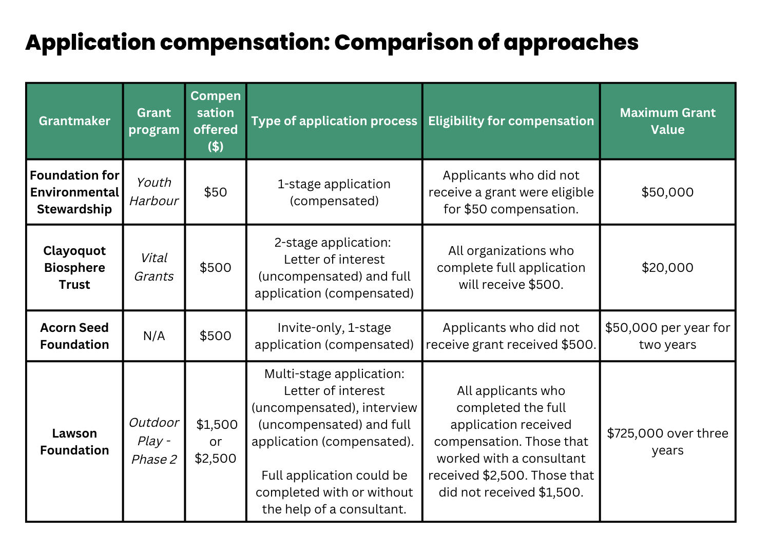 On the other end of the application compensation spectrum, the Lawson Foundation, a Toronto-based family foundation, offered the highest amount of four grantmakers for their 2021 grant stream focused on children’s outdoor play. However, in contrast to FES, the application process Lawson used was three-stage, limiting the potential number of applicants, and was comparatively time-intensive.