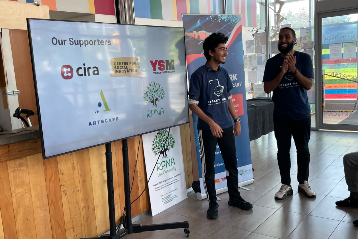 Program coordinator Abdirahman Mohamed (right) and staff member Shah Ehsan Haque (left) at the Regent Park Technology Lending Library opening in September 2023. Image courtesy of the Regent Park Technology Lending Library.