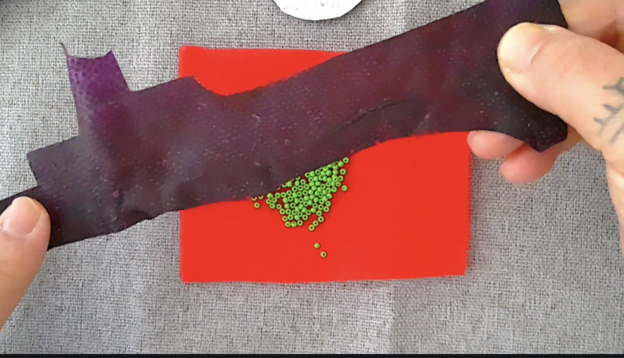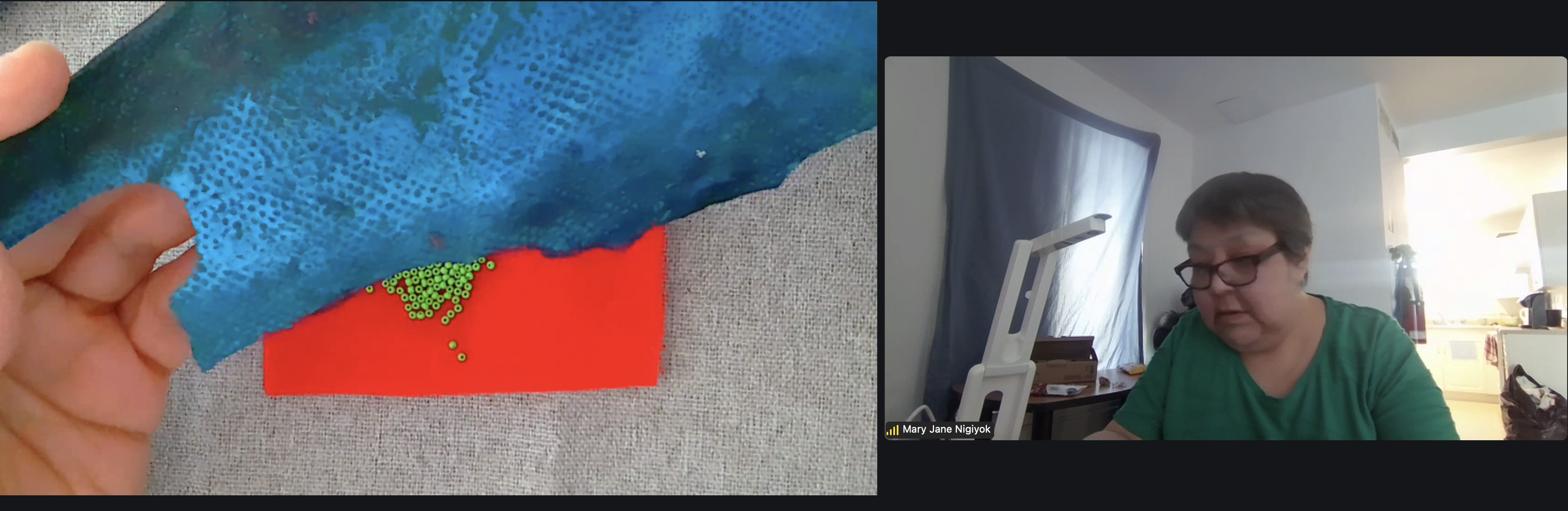 Students received packages to follow along as Nigiyok guided them through the art of beading using two cameras: one focused on her, and the other zoomed in on her hands through a document camera, providing a close-up view of her instructions.