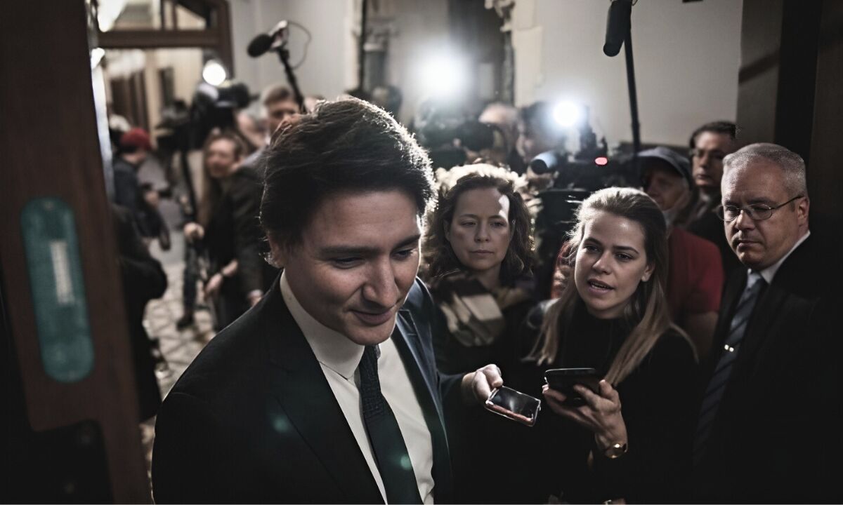 Prime Minister Justin Trudeau runs the media gauntlet in Ottawa in 2023. (Adam Scotti/Instagram.)