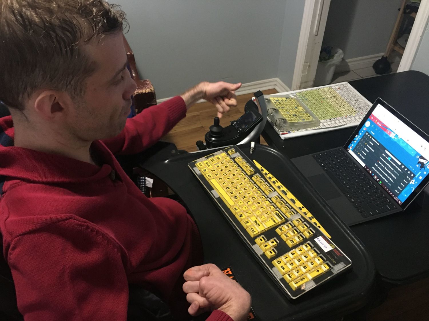 During the lockdowns, Whyte began meeting weekly with Crane, who created a replica website of Whyte’s physical board. The website, displayed through a tablet which is placed on Whyte’s wheelchair table, allows him to click on words which can be read through a text-to-speech software or copied and pasted to fill out forms online, and send messages.