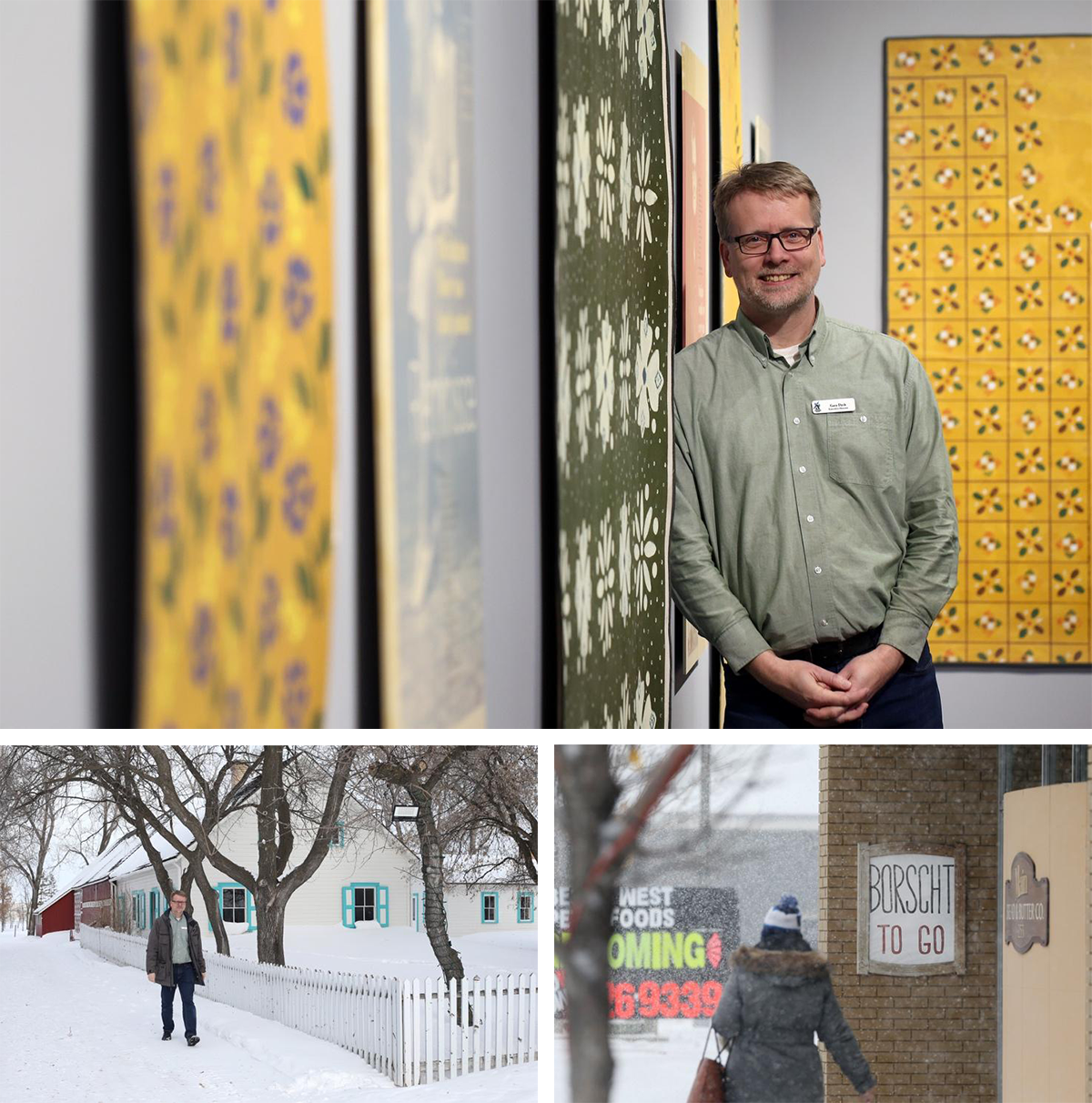 Gary Dyck, executive director of the Mennonite Heritage Village, stands in an exhibit featuring Mennonite floor patterns (above) then walks past one of the village’s heritage buildings (below, left). A woman walks past a restaurant offering “Borscht to Go” in downtown Steinbach. Photos: Shannon VanRaes
