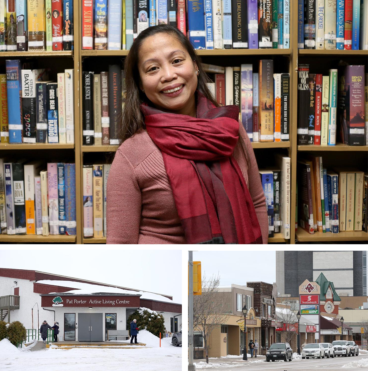 Mergie Fiesta Seewald (top) and the Pat Porter Active Living Center where she volunteers (bottom left.) Steinbach’s Main Street (bottom right). Photos: Shannon VanRaes