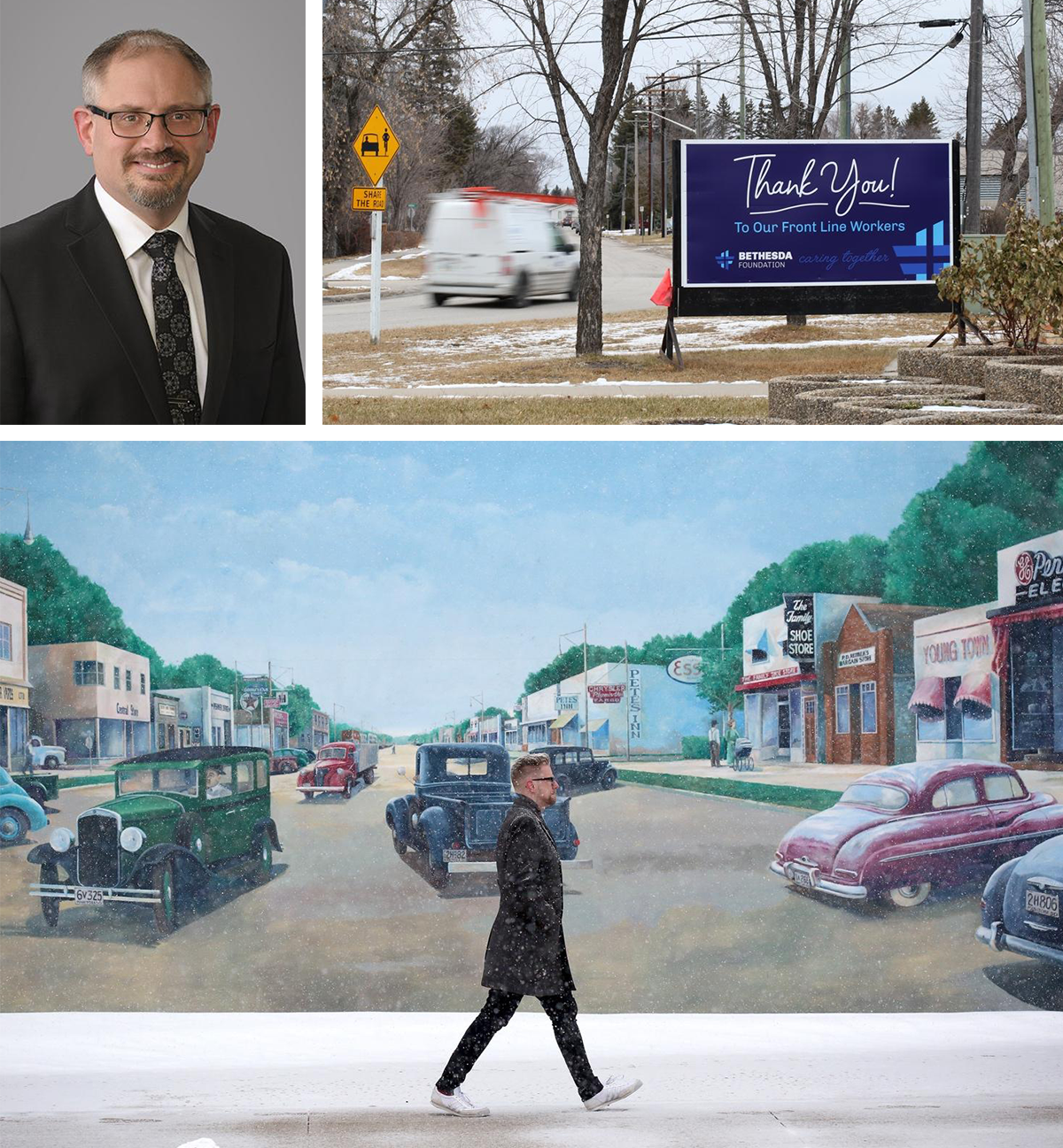 Steinbach Mayor Earl Funk (top left). Photo: courtesy of the City of Steinbach. A sign thanks frontline workers (bottom left) and a man walks past a mural depicting Steinbach’s historic Main Street. Photos: Shannon VanRaes