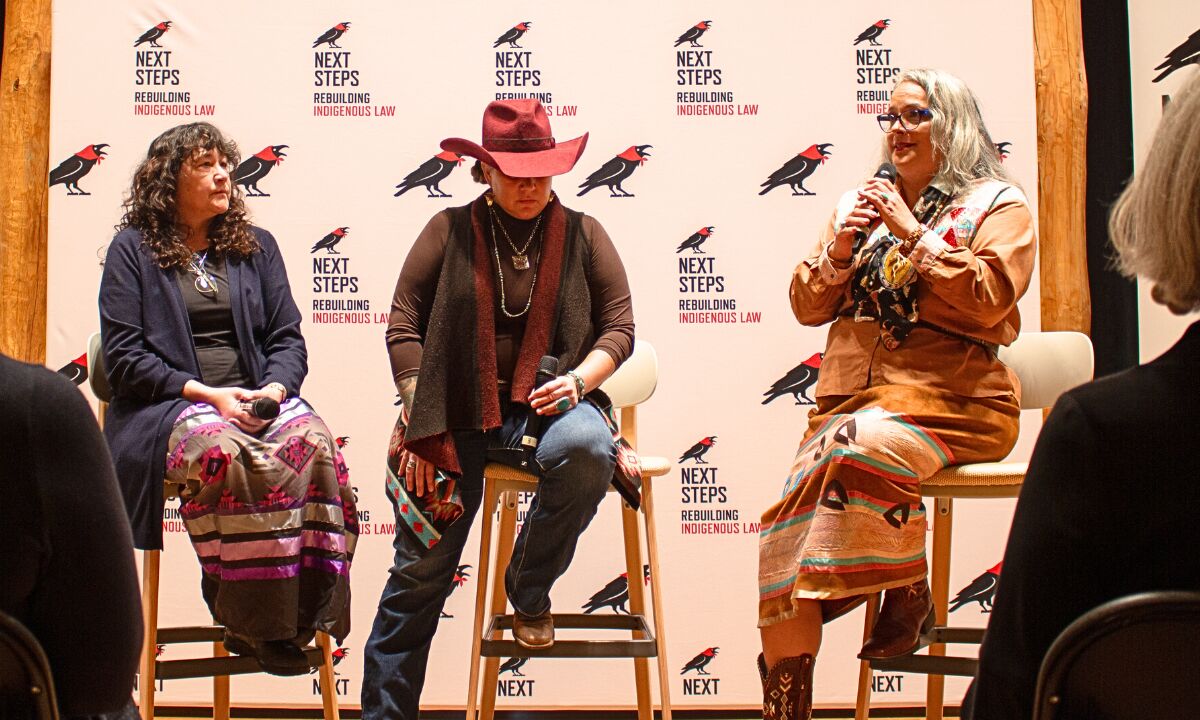 Racelle Kooy speaks alongside fellow Secwépemc Law associate research directors Sunny LeBourdais (middle) and Bonnie Leonard (left) during the Voices From the Field segment of the Next Steps research initiative launch. (UVic/Supplied)